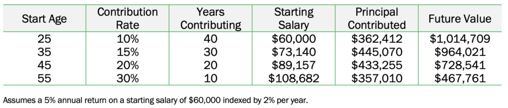 While larger contributions can help if you start later, the greatest benefits come from beginning early and maintaining steady savings.
